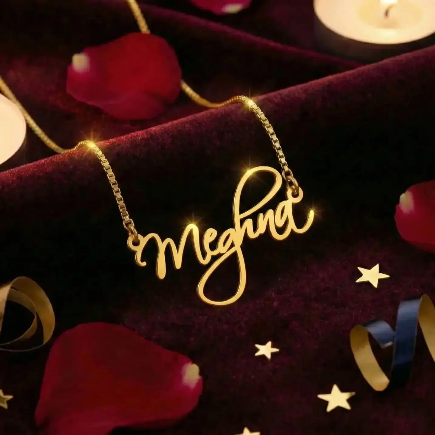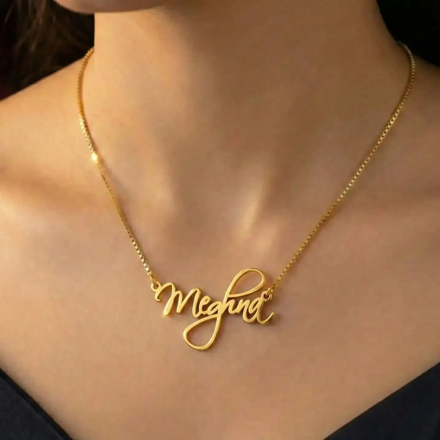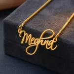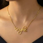 The delicate nameplate curves gently around your neck, creating a mesmerizing display of femininity and grace. The cursive letters dance and swirl, creating a one-of-a-kind statement that is as unique as you are.