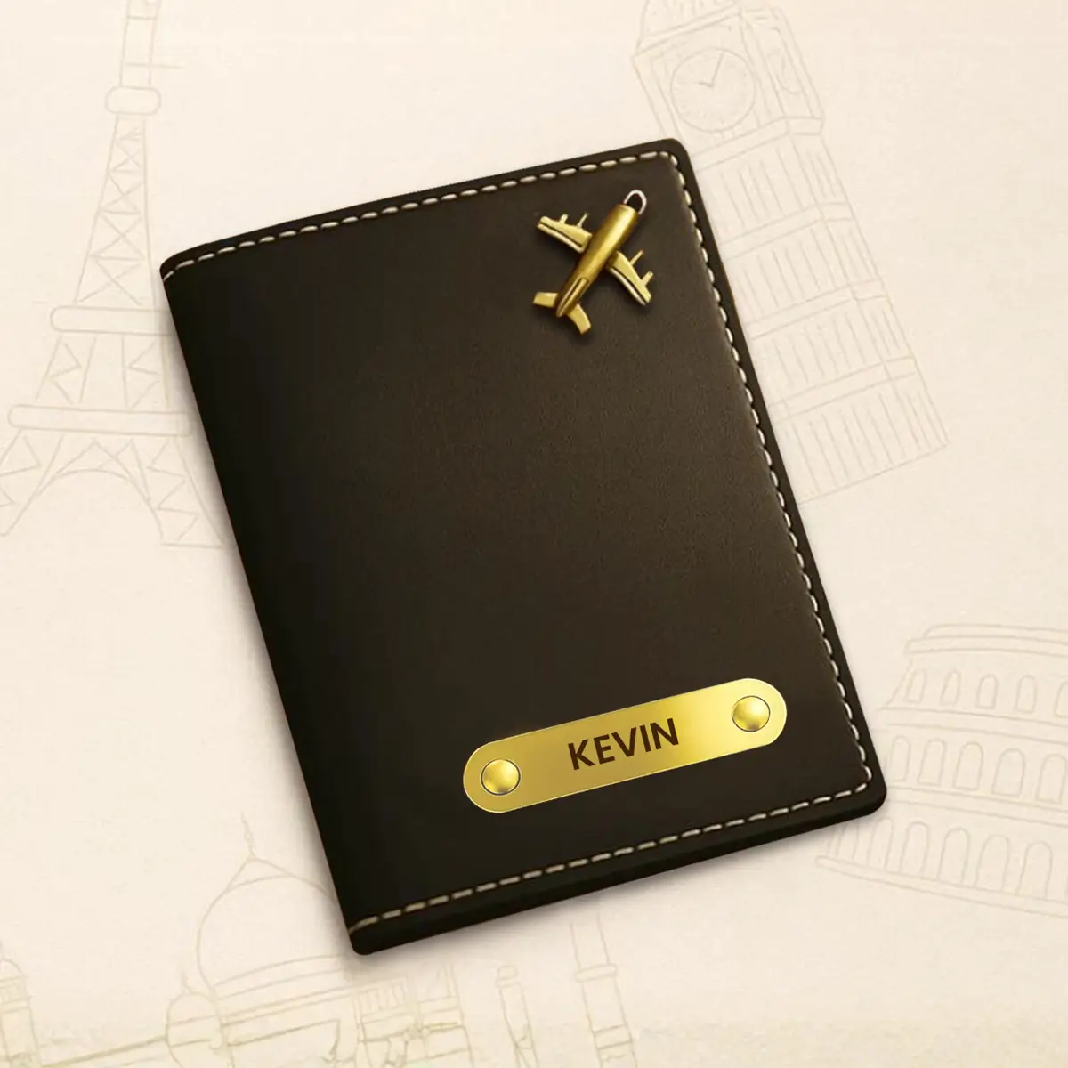 Travel in style and keep your essentials organized with this elegant black passport cover personalized just for you. Made from high-quality faux leather, this cover features neat white stitching and a golden airplane charm that adds a trendy travel vibe.