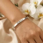 Overall, the Men And Women Silver Adjustable Name Bracelet in the image is a stylish and eye-catching piece of jewelry. The combination of the gleaming silver, the clean engraving, and the wide band makes it a real statement piece. It would be a wonderful gift for someone special, or a treasured addition to any jewelry collection.