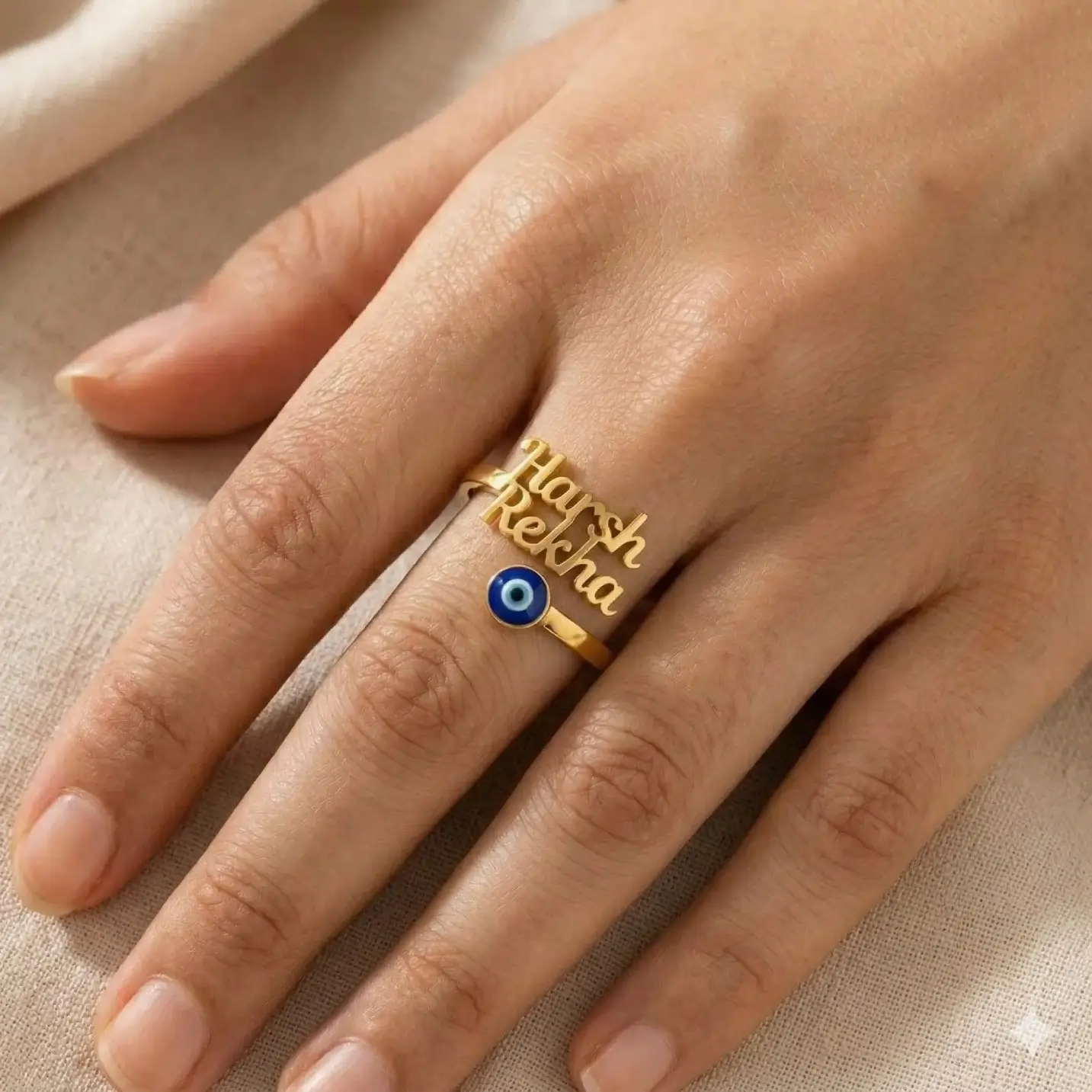 Celebrate your unique bond with this personalized evil eye couple name ring. Featuring the names in a stylish script, this ring symbolizes your connection while offering the protective energy of the evil eye. This unique piece is a beautiful expression of love and safeguarding.