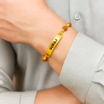 Elevate your style and spirituality with this beautifully crafted Mahadev-inspired Rudraksha bracelet. Designed with genuine Rudraksha beads and golden accents, it features a sleek customizable name plate (shown here with the name “Suraj”) for a personal touch. This bracelet blends traditional significance with modern aesthetics, making it perfect for daily wear or gifting to someone special.